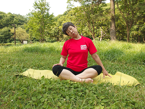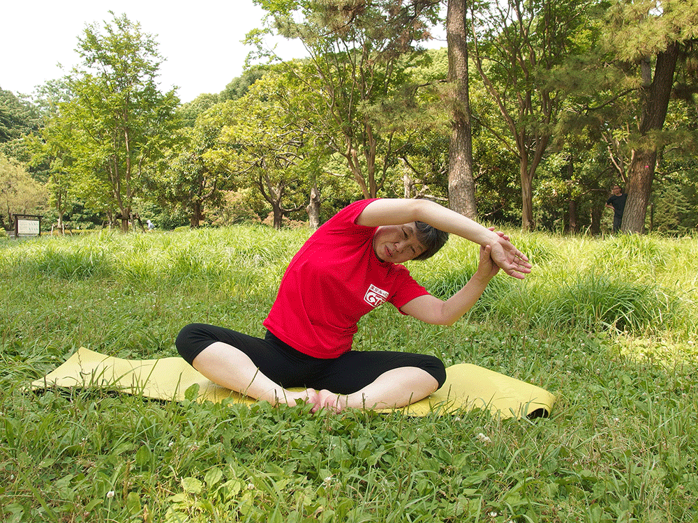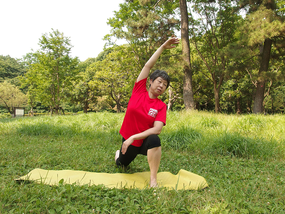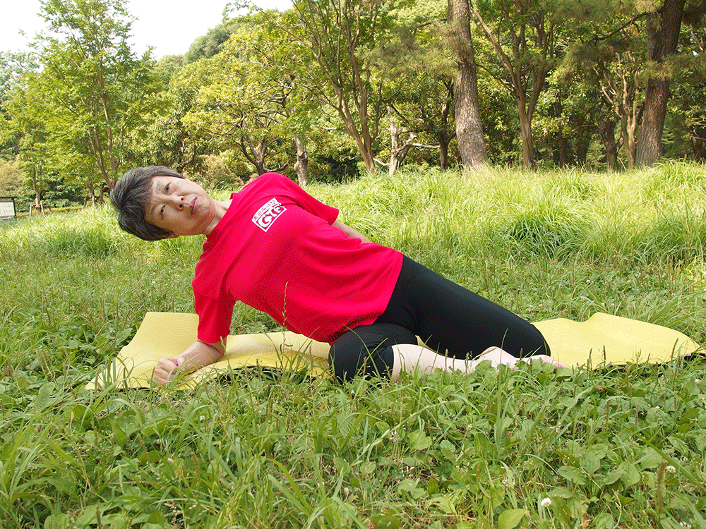 前かがみにならず、真横にしっかり伸ばすこと。下の手は必ず身体を支えます。しっかりと支えないと身体が不安定になり腰を痛める原因となります。また、腕をしっかり伸ばすのは身体が温まってからにしましょう。