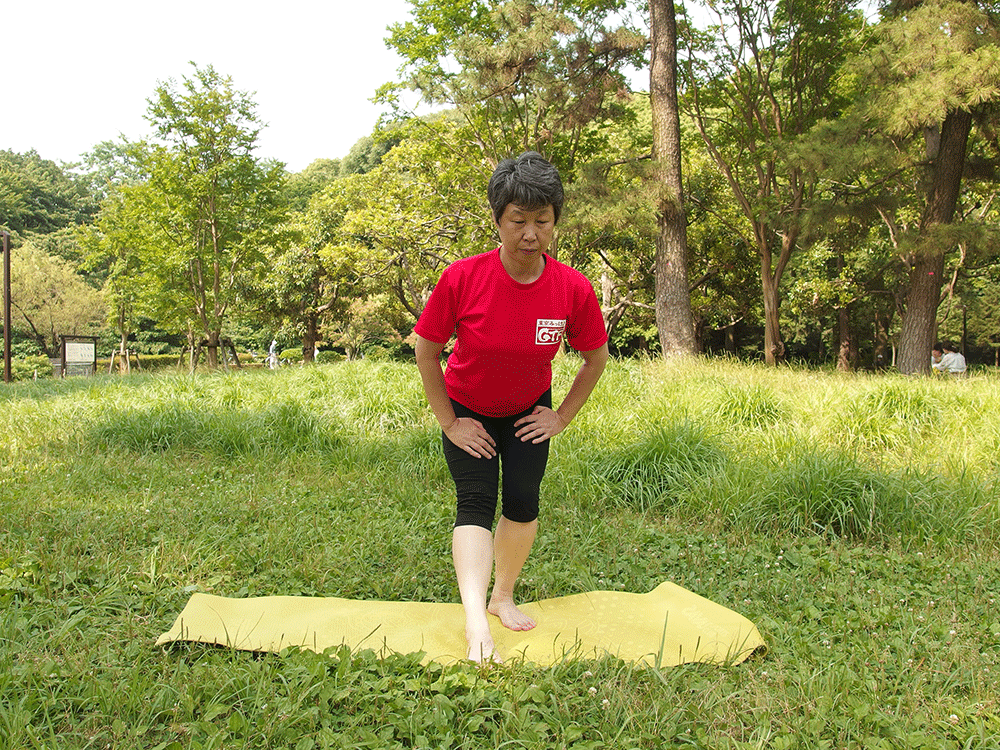 拳2個分くらいの脚幅で立ち、片方の脚を半歩後ろに引きます。前の脚に体重を乗せて曲げます。このときつま先よりヒザが前に出ないように注意しましょう。関節を痛める原因となります。後ろの足のつま先は正面を向き、地面にしっかりとつけます。かかとが浮くときは、上体をたてるか前後の脚幅を小さくするようにします。