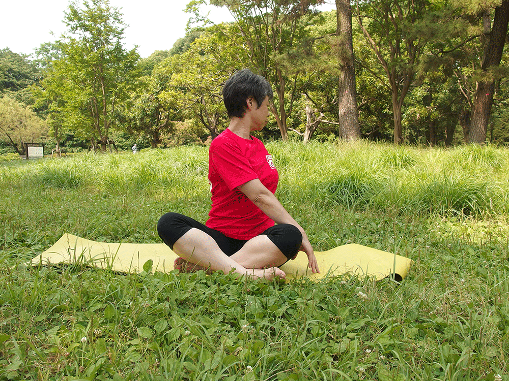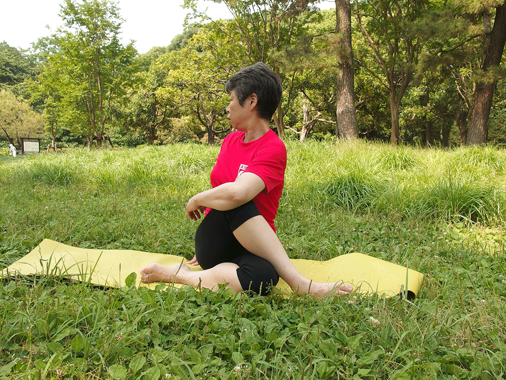 足の裏でお尻をくっつけ、骨盤を中心にユラユラと身体を揺すります。このときひざが浮いても大丈夫。開いた左右のひざの高さが違う場合は骨盤にゆがみがあるかもしれません。
