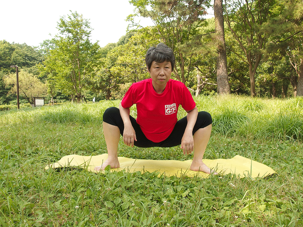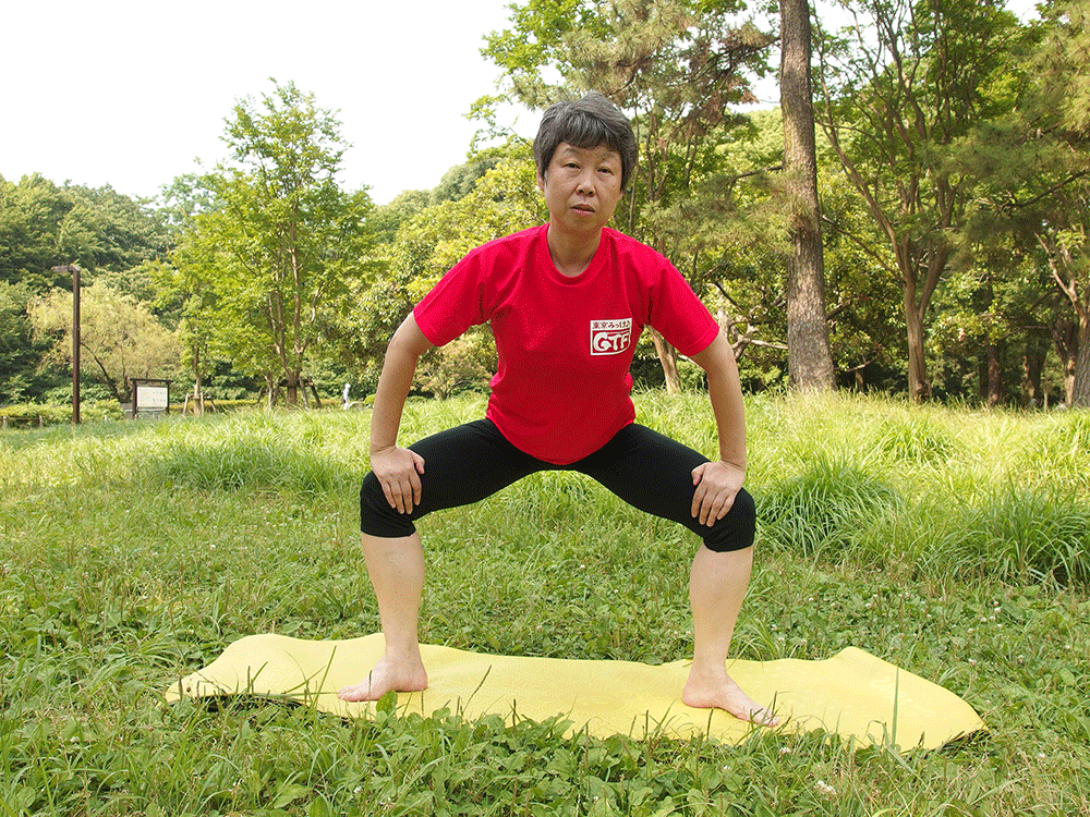腰幅より大きく脚を開き、つま先を60度くらいに開いた”門型”にします。このときひざの高さよりお尻がさがらないようにすること。手はひざの上に置き頭は真っ直ぐ上を向くようにして前屈みにならないようにしましょう。手で身体を支えたいときは、上半身に力を入れたり、肩が上がらないように注意しましょう。