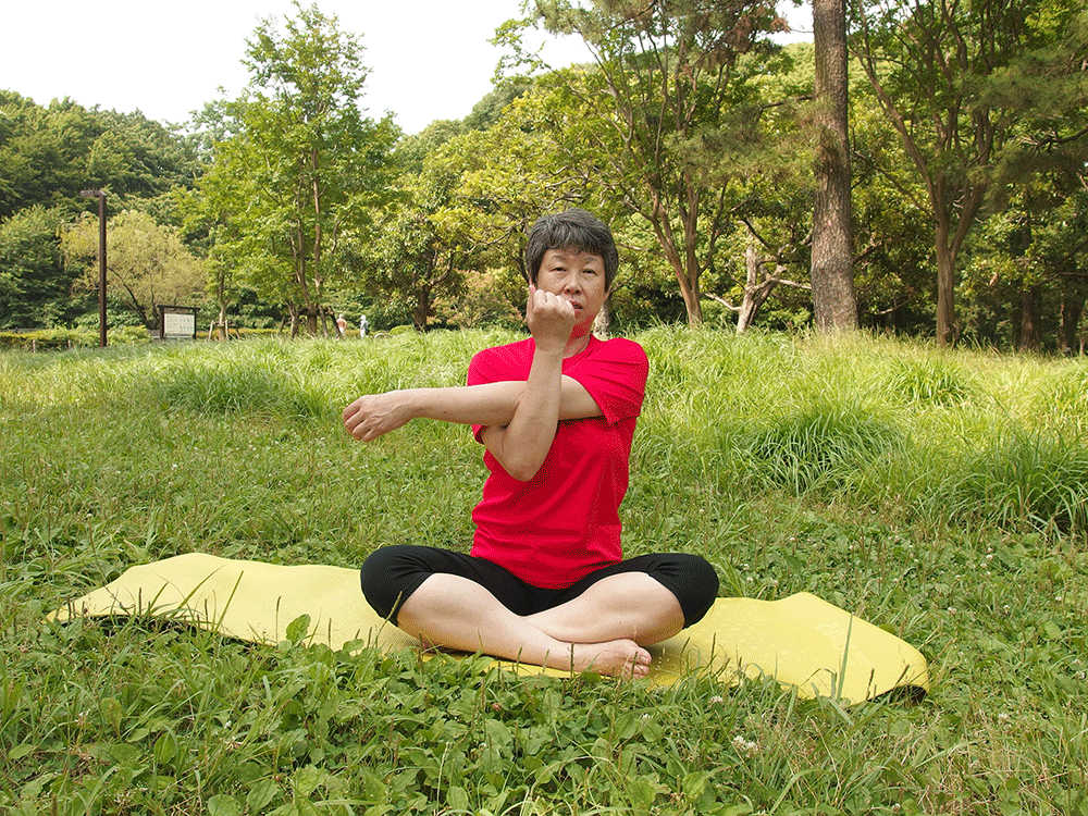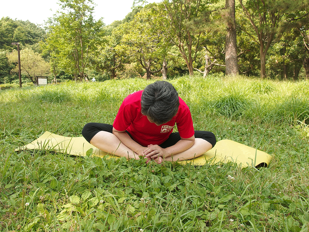 猫背にならないように背中をピンとして座り、腕を後ろに回して指先をつかみます。このとき首は動かさずじっくり伸ばすこと。首に筋肉は弱いので無理をしないことが大切です。