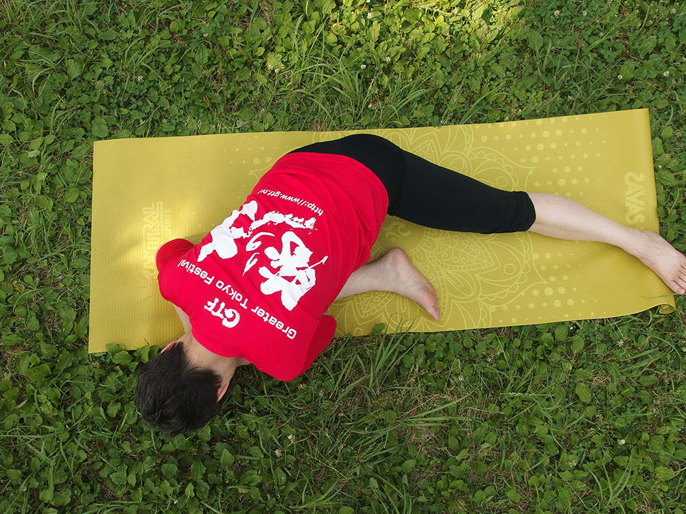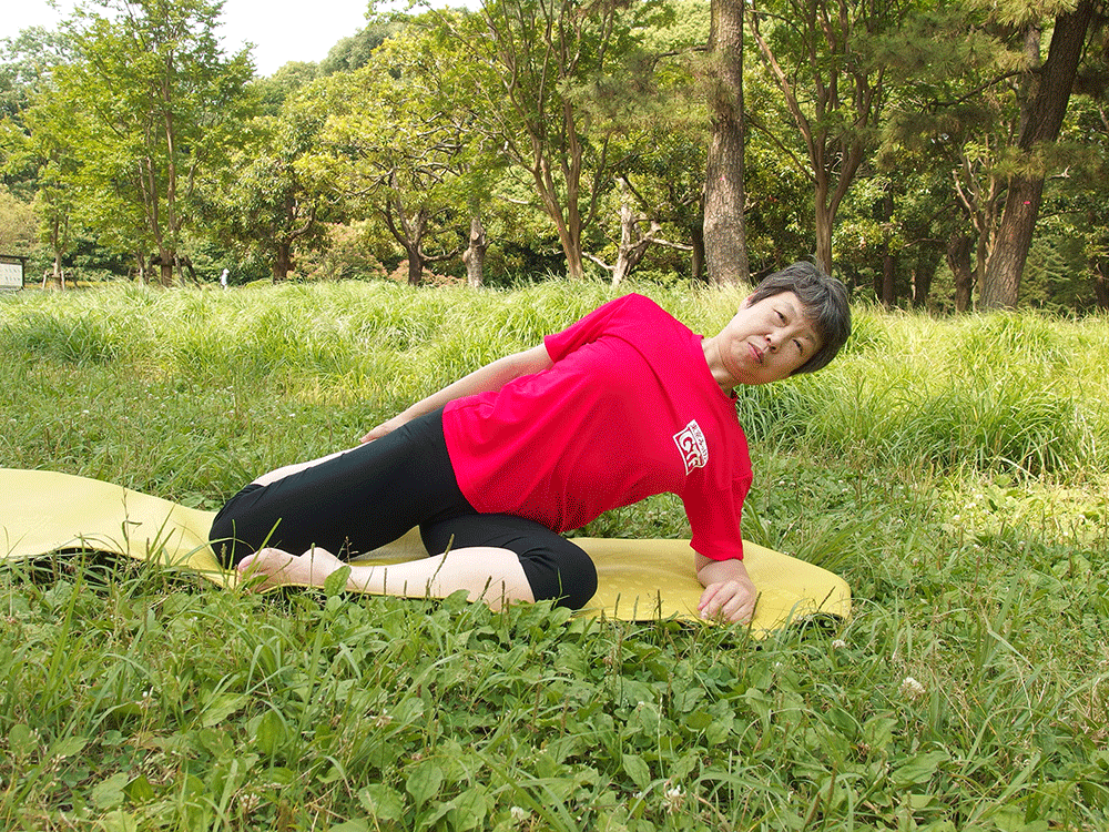 ももの前が伸びていないため、腸腰筋が伸びません。足首をお尻に近づけて、下側の脇腹が下がらないようにしましょう。