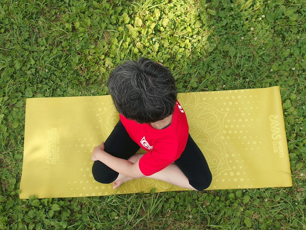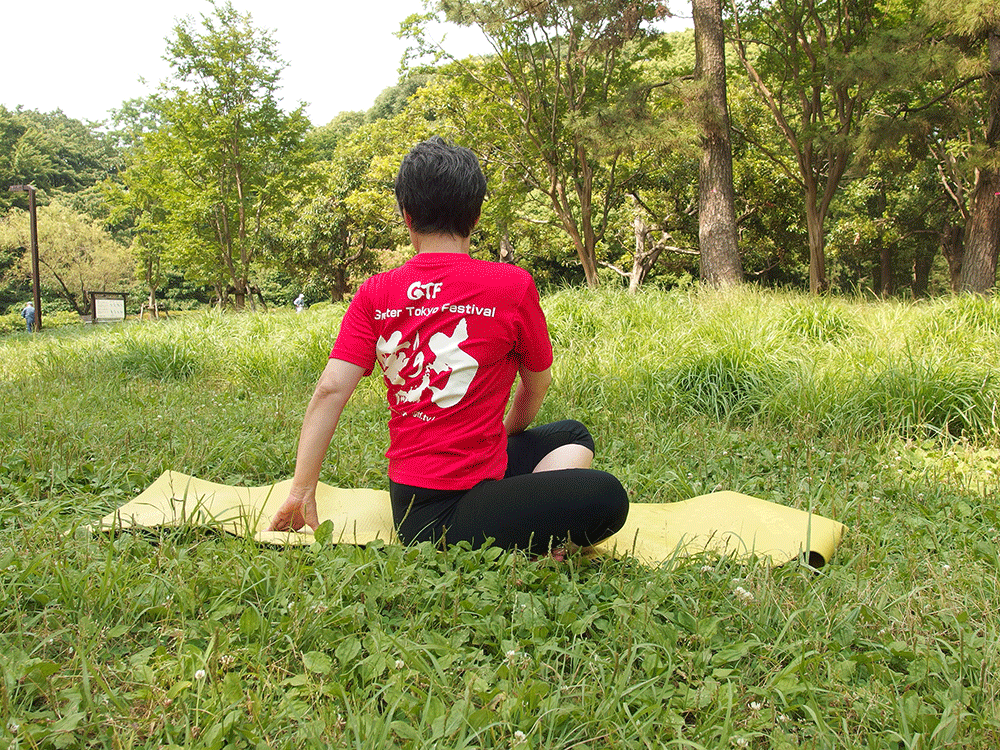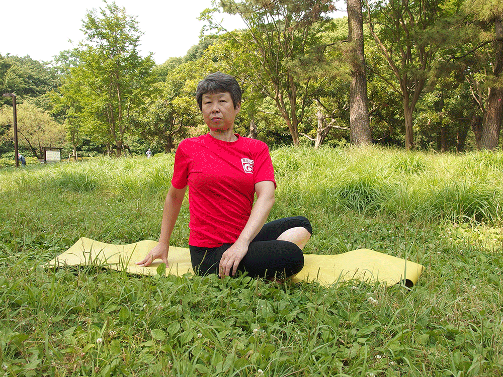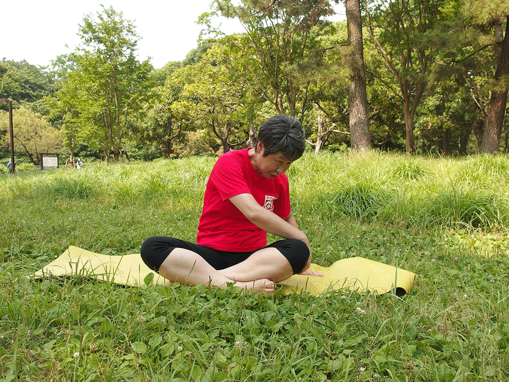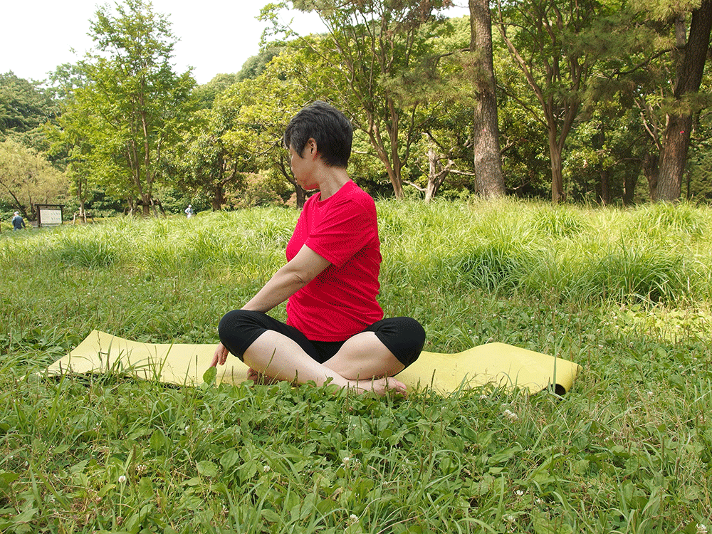ヒザが痛いときは脚を伸ばしたままで座ってもOK。首が痛いときは顔は正面を向けたまま肩から回転するようにしましょう。
