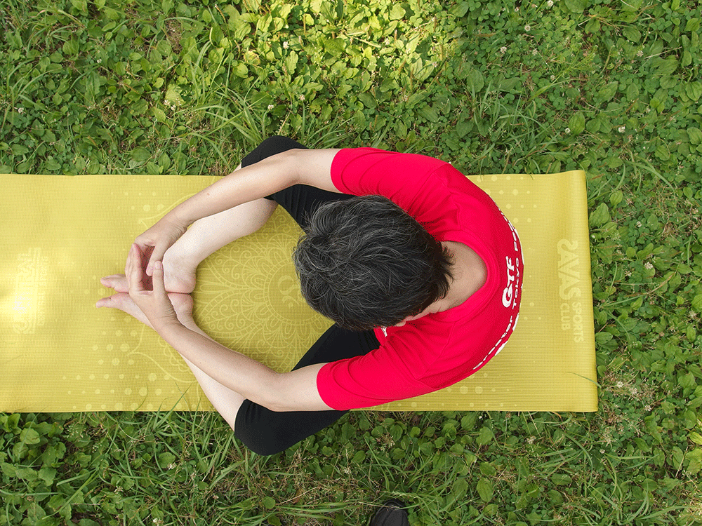 背筋を伸ばさないと、腕と首を曲げているだけで背中は伸びません。