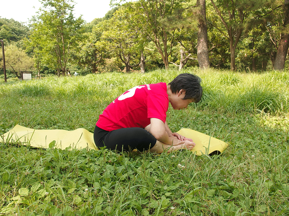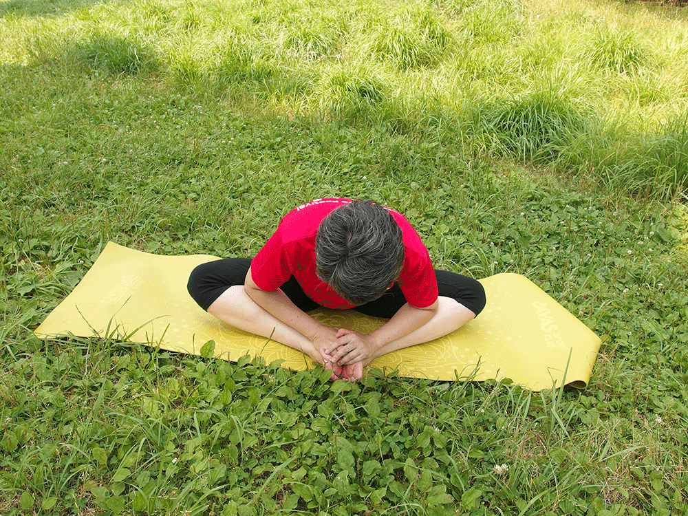 ヒザが痛いときは片足づつ折り曲げ前屈の角度をゆるくします。