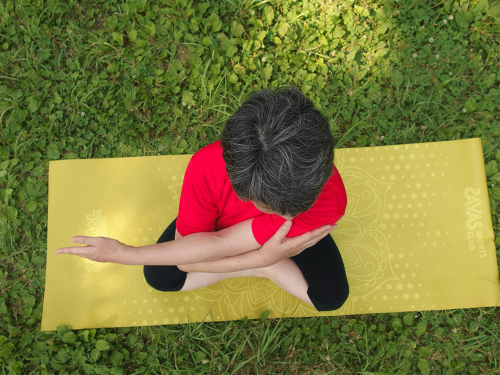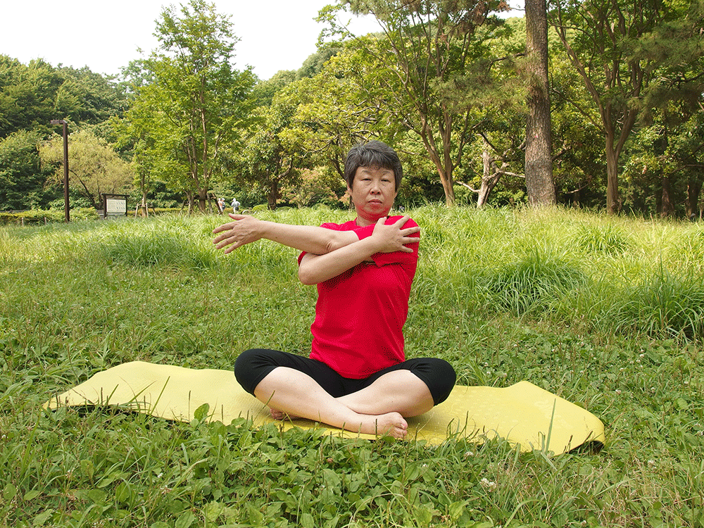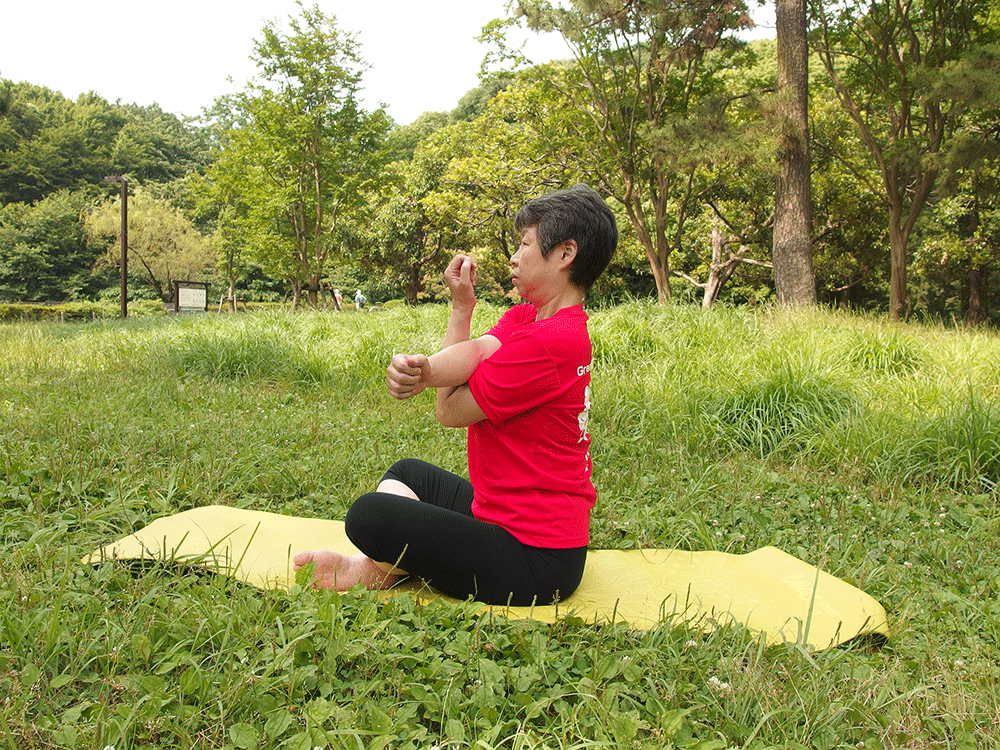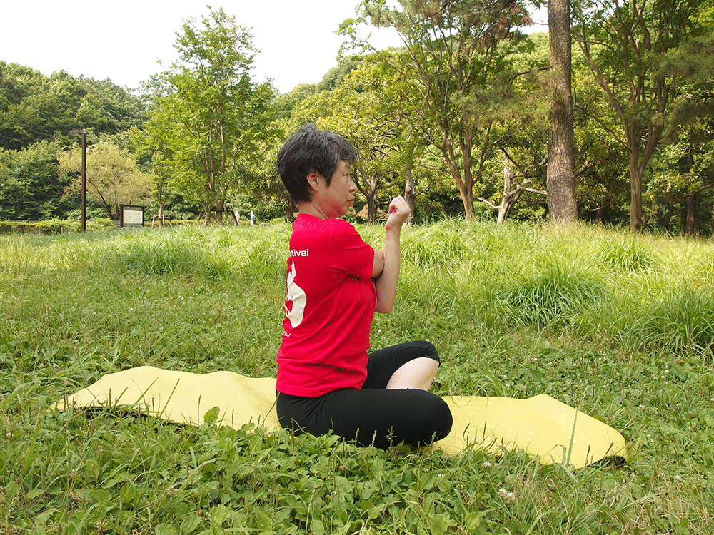 腕は斜め下に置いても大丈夫です。ヒジが伸ばせないときは曲げたまま首に巻き付けるようにします。